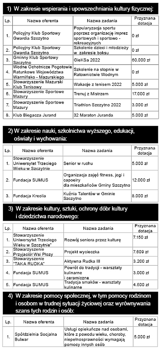 Na corocznie ogłaszany przez wójta gminy Szczytno konkurs wpłynęło 17 wniosków, z czego pozytywną weryfikację przeszło 14. Z puli liczącej blisko 150 tys. zł najwięcej, bo 90 tys. zł zostanie przeznaczonych na zadania z zakresu upowszechniania kultury fizycznej. Tu największymi beneficjentami będą klub piłkarski GKS Szczytno i kierowane przez Annę Jesień Stowarzyszenie Sportowe Mazury - na organizowane przez nie zawody triathlonowe i zajęcia z młodzieżą „Trenuj z mistrzem”. W zakresie edukacji gmina dofinansuje trzy działania skierowane dla seniorów, uczestników zajęć fitness, jogi i capoeiry oraz „Kuźni Talentów”.{akeebasubs !*}