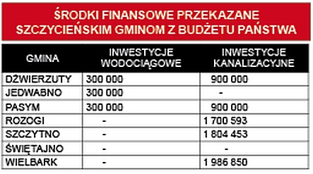 W ubiegłym tygodniu rząd zdecydował, by wesprzeć dodatkowymi środkami regiony, które najbardziej tego potrzebują. Przy podziale 4 mld zł zastosowano algorytm uwzględniając w nim gminy, w których liczba mieszkańców korzystających z sieci wodociągowej nie przekracza 90%, a kanalizacyjnej – 60%. Na liście beneficjentów znalazło się 1714 miast i gmin z całej Polski, w tym 72 z województwa warmińsko-mazurskiego, z czego sześć z powiatu szczycieńskiego. Samorządy otrzymają środki automatycznie jeszcze w tym roku, bez konieczności składania wniosków. Będzie je można przeznaczyć zgodnie z potrzebami i wydać w latach 2021-2024.