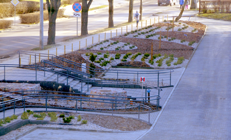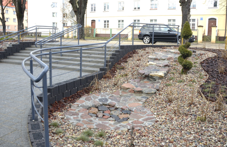 Jeszcze przed zimą chwaliliśmy firmę „Novum” za nocną iluminację nowo postawionych budynków - magazynu i biurowca przy ul. Chrobrego. Teraz przed nimi powstaje coś w rodzaju ozdobnego ogrodu skalnego. Została zagospodarowana cała skarpa od bramy wjazdowej aż po parking samochodowy przy torach kolejowych. Są tu zejścia ze schodkami i rampami zjazdowymi z metalowymi barierkami dla osób niepełnosprawnych. Widać też miejsca na rabaty z kwiatami i wyższą roślinność - iglaki o ciekawych kształtach i drzewka liściaste. Nawet jest już