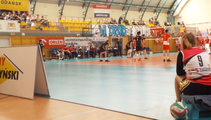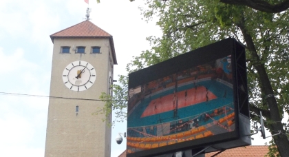 Informacja dla tych, którzy mówią, że w Szczytnie nic się nie dzieje: miniony tydzień upłynął pod znakiem finału Mistrzostw Polski Kadetów w Piłce Siatkowej. Nadzieja polskiego volleyballa rywalizowała w hali im. Wagnera i naprawdę było na co popatrzeć. Podczas spaceru ul. Lanca wystarczyło wejść na parę chwil do wspomnianego przybytku sportu, by znaleźć się w trochę innym świecie. Rozkrzyczane i rozmuzycznione (bębny, piszczałki etc.) trybuny zagrzewające młodzież do boju, transparenty, plac do gry ze specjalną wykładziną, stojące wokół boiska reklamy (fot. 3) – tak na co dzień w naszej hali nie bywa. Mecze można było oglądać również na żywo w Internecie oraz – zgodnie z zapowiedzią podaną przez miejski serwis www. – na telebimie na placu Juranda. Telebim nie byłby sobą, gdyby podczas imprezy rangi mistrzowskiej nie przestał w którymś momencie działać. Tak było np. podczas sobotniego meczu o 7. miejsce, gdy ekran był czarny. Już później oglądanie stało się możliwe (fot. 4). Inna sprawa, że obraz skierowano w stronę ronda, dźwięku chyba nie włączono, a odczytywanie wyniku w rogu ekranu ze względu na nie najnowszą już technologię wykonania telebimu stanowiło niemałe wyzwanie.