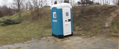 Niedawno, pisząc o problemie miejskich toalet, dziwiliśmy się, że ta na cmentarzu czynna jest tylko przez pół roku. Jej otwarcie nastąpiło trochę wcześniej niż 1 maja (taki termin podawano na wywieszonej kartce), ale to i tak późno. Nasza toaleta znajdująca się w murowanym budynku musi być na jesień, zimę i część wiosny zamykana – podobnego kłopotu nie ma np. w Giżycku czy znacznie mniejszych od Szczytna miejscowościach jak Olsztynek czy Pieniężno. Tam swoje zadanie przez cały rok wypełniają toi toie (fot. 7), ustawione tuż przed cmentarzem lub na jego terenie. Byliśmy mile zaskoczeni tym, że wewnątrz było czysto, a bardziej potrzebujący mieli papieru toaletowego pod dostatkiem, co w polskich toaletach nie zawsze, niestety, bywa normą.