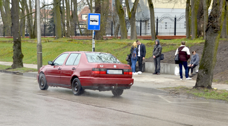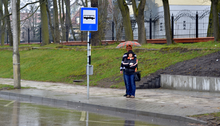 Dwoje pasażerów, wyczekując na środek lokomocji, schroniło się pod parasolem. Akurat mieli przy sobie ów sprzęt. Nieco później, gdy zbliżały się godziny szczytu, pojawiło się na przystanku więcej podróżników. Jak widać na zdjęciu, jeden z młodych mężczyzn usadowił się na murku oporowym, dzięki czemu przynajmniej siedzi. Może niezbyt wygodnie, ale zawsze to lepiej niż stać. Poza tym warto jeszcze wspomnieć o dodatkowym mankamencie. W odróżnieniu od starego miejsca, tutaj samochody jeżdżą z dużą prędkością i gdy pada, ochlapują osoby zgromadzone na przystanku.