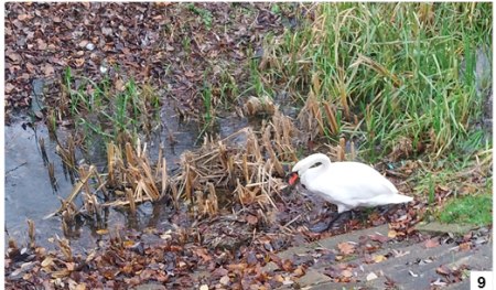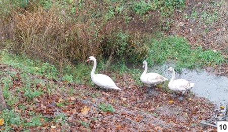 Tuż przed mostkiem napotkała ona przeszkodę w postaci gęstej roślinności. Po chwili namysłu jeden z łabędzi postanowił przetrzeć szlak pieszy i obejść barierę bokiem (fot. 9). Tak też uczyniły pozostałe. Po drugiej stronie napotkały jeszcze gęściej rosnące zielone przeszkody, które wchodziły aż na skarpę (fot. 10) . Ptaki próbowały, lecz nie potrafiły najwyraźniej podejść pod zbyt stromą górkę i... zawróciły. Co było dalej – przyznamy się szczerze, nie śledziliśmy. Łabędzie, rzecz jasna, potrafią latać, ale z miejsca nie wzniosą się w powietrze, potrzebują sporego kawałka tafli do rozpędzenia się – niczym samolot. Z jakiegoś powodu w tym dniu chciały poprzemieszczać się drogą wodną. Plany spaliły na panewce.