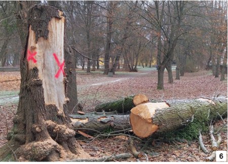 Sezon lęgowy za nami, rozpoczął się zatem czas wycinek i przycinek. Pod topór idą okazy chore, szpecące daną miejscowość i zagrażające bezpieczeństwu przechodniów i kierowców. Podobnie jak w latach ubiegłych zmniejszony został drzewostan parku przy szczycieńskiej Szkole Podstawowej nr 3 – m.in. blisko ulicy (fot. 6). Jak widać, czerwony znak „X” zapowiadał wycinkę. Inny „X” jest widoczny parę metrów dalej (fot. 7). Niestety, tak rosnące dość okazałe drzewa same mogą za jakiś czas dokonać swojego żywota. Przycinka była prowadzona w pobliżu innej szkoły - „Dwójki”