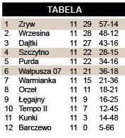 W piątek grę tu i ówdzie uniemożliwiał śnieg, Wałpusza musiała w niedzielę zagrać za to w błocie. Mimo anormalnych warunków potrafiła wbić autsajderowi pięć bramek. Bez punktów wrócił GKS Szczytno, który minimalnie przegrał z walczącym o awans zespołem z Wrzesiny.