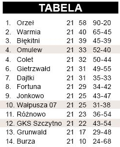 Omulew: Gwiazda, A. Cieślik, Chorążewicz (78. Krasecki), Szczepkowski, Ambroziak (65. Kempiński), Raniecki, Pliszka (83. Tabaka), Olender, Borowski, Remiszewski, M. Abramczyk.