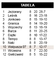 Wałpusza, podobnie jak GKS Szczytno, kontynuuje kiepską serię. Gospodarze wypracowali całkiem sporo sytuacji, przez pół godziny grali w przewadze (czerwona kartka dla zawodnika Leśnika za niesportowe zachowanie), ale ponieśli wysoką porażkę.