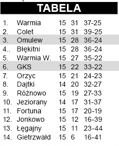 W ostatniej serii swoją dobrą formę potwierdzili Błękitni Pasym, którzy zasłużenie wygrali na wyjeździe z faworyzowanym Orłem Janowiec Kościelny. Coraz większą stratę do drużyn zajmujących bezpieczne miejsca w tabeli mają drużyny Gwardii Szczytno i Perkuna Orżyny. W klasie A punkty pogubiły zespoły ze ścisłej czołówki, na czym skorzystała wielbarska Omulew.