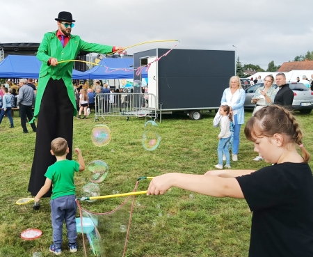 Po części oficjalnej mieszkańcy oraz zaproszeni goście obejrzeli występy dzieci i młodzieży, uczestników ŚDS oraz zespołu śpiewaczego „Wrzosy”. Na dożynkach nie mogło też zabraknąć barwnych i pomysłowo udekorowanych stoisk sołectw oraz kół gospodyń wiejskich. Wszystkie one dołożyły starań, aby nie tylko cieszyły one oczy, ale i podniebienia. Liczne atrakcje czekały także także na najmłodszych, którzy mogli uczyć się chodzenia na szczudłach, puszczali bańki mydlane oraz bawili się na dmuchanych zjeżdżalniach.