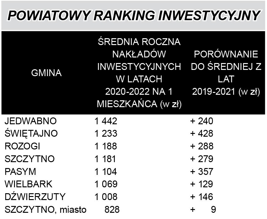 Wśród miast powiatowych Szczytno również prezentuje się słabo. Nakłady inwestycyjne per capita poprawiło zaledwie o … 9 zł i z kwotą 827 zł spadło ze 102. pozycji w kraju na 120., zachowując jednocześnie 6. miejsce w województwie. Na Warmii i Mazurach liderem jest Nowe Miasto Lubawskie (1459 zł) przed Lidzbarkiem Warmińskim (1413 zł) i Nidzicą (1038 zł).