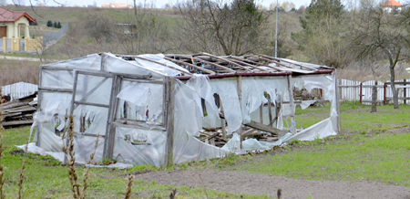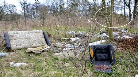 Gdzie indziej domki rozpadły się całkowicie i tylko pozostały po nich fundamenty. Obok gruzowiska napotykamy na elementy niegdysiejszego wyposażenia domku – stare, rozpadające się tapczany, fotele oraz góry innych, drobniejszych śmieci. Przy czym wszystko to wala się nie gdzieś z dala od terenów miejskich, a tuż pod blokami mieszkalnymi stojącymi przy ul. Ślaskiej. Zaznaczony białym otokiem kryjący się za chaszczami budynek to blok nr 12. Niektóre skrawki ziemi wyglądają na nadal uprawiane, ale