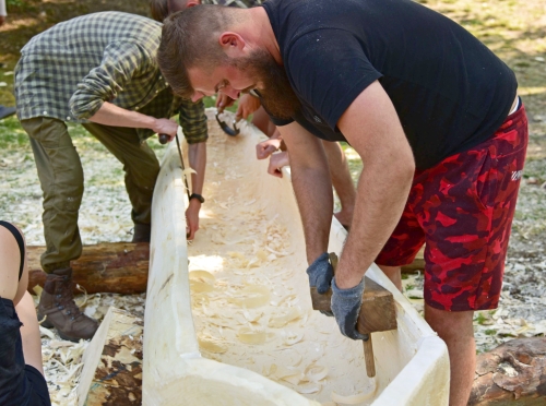 W pierwszej połowie sierpnia w Spychowie odbyły się trzynaste już warsztaty ekologiczno-kulturalne „Święto Mazurskiej Dłubanki”. To wydarzenie organizowane cyklicznie przez Nadleśnictwo Spychowo polega na wykonaniu tradycyjnych łodzi jednopiennych, tzw. dłubanek z jednego pnia drzewa. Do dyspozycji uczestników były w tym roku kłody osikowe, które idealnie nadają się na produkcję tego typu jednostki pływającej. Na wykonanie dłubanek było zaledwie kilka dni, zatem oprócz tradycyjnych narzędzi, takich jak ciosła, siekiery, ośniki czy strugi, w ruch szły również pilarki łańcuchowe, które pomagały na początku szybko nakreślić ogólny kształt łodzi.