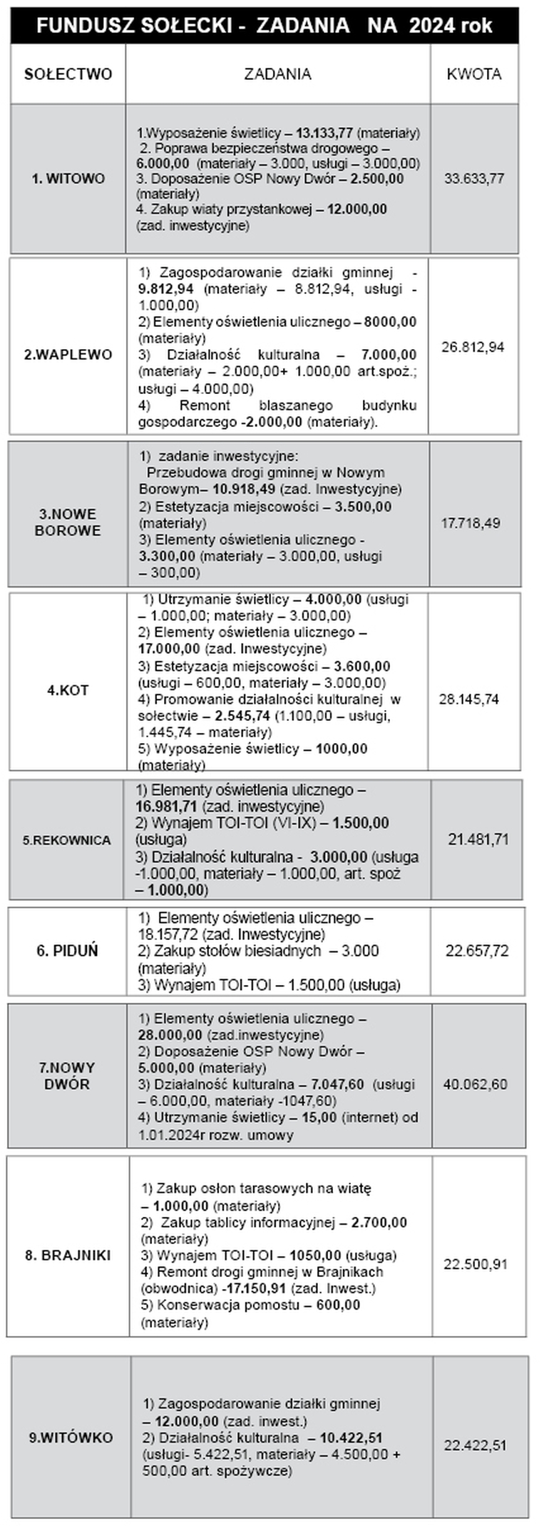 Ponad pół miliona złotych w tym roku otrzymają sołectwa w gminie Jedwabno na realizację zadań w ramach funduszu sołeckiego. Podobnie jak w latach ubiegłych, dominować będą działania o charakterze inwestycyjnym – oświetlenie uliczne, zagospodarowanie wiejskich działek, doposażenia placów zabaw, czy drobne remonty dróg gminnych. Zarezerwowano też środki na organizację imprez, festynów i zajęć warsztatowych. Kilka sołectw tradycyjnie już od lat, doposaży z części funduszu swoje jednostki OSP.