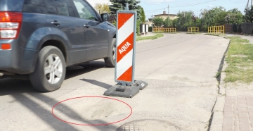 - Daliby jaki szpadel, to sam bym zasypał. Mogłem tu mieć czołówkę – irytuje się nasz Czytelnik, pan Jarosław. Co jest tego powodem? Od kilku tygodni w pobliżu jednej ze studzienek kanalizacyjnych na ul. Osiedleńczej stoi ogranicznik skrajni (fot. 9). Nakazuje on ominięcie znajdującego się tu zapadliska, mającego coś koło pół metra średnicy. Zabezpieczenie jest jak najbardziej potrzebne, grunt w tym, że stoi już ono dość długo (żadne prace nie są chyba prowadzone), a kilkadziesiąt metrów za nim (jazda w stronę ul. Leśnej) znajduje się dość ostry zakręt. Kierowcy omijający ogranicznik muszą zjechać na drugą stronę jezdni, nie widząc jednak, co dzieje się kawałeczek dalej, bo widok zasłania ogrodzenie. W godzinach zwiększonego ruchu dochodzi tu do sytuacji pachnących stłuczkami. Poruszający się z naprzeciwka nie widzą, niestety, żadnego znaku nakazującego zachowanie ostrożności i o nieszczęście blisko.