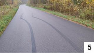 Co duzi chłopcy robią po dniu ciężkiej pracy lub nauki? Czym można wypełnić nadmiar wolnego czasu po zjedzeniu fastfoodowego obiadu i sprawdzeniu wszystkiego na rozmaitych tiktokach? Trzeba włączyć głośno fajną muzę i ruszyć w trasę! Dokąd? To raczej nieistotne. Trasę trzeba, rzecz jasna, oznaczyć, niczym piesek. Niech wszyscy wiedzą, że ja tu byłem i się fajnie bawiłem. Ślady takich inteligentnych zabaw zobaczymy na większych parkingach pod sklepami. Ale nie tylko. Pełno śladów, które wskazują na zimną krew kierowców, troskę o zdrowie i życie innych użytkowników trasy, a także przebiegających przez nią zwierząt, zobaczymy chociażby na leśnej drodze łączącej Szczytno z Sędańskiem. O różnych podejrzanych śladach opon na asfalcie pisaliśmy już kiedyś, ale ostatnio takich odcisków zdecydowanie tam przybyło. A to jakieś kółeczka (fot. 4) , a to jakieś zygzaczki (fot. 5). Niestety, dopasowanie zasad otrzymywania prawa jazdy do stanu umysłu niektórych przyszłych kierowców nie jest sprawą łatwą.