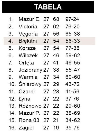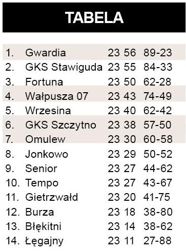Wynik sobotniego spotkania to prawdopodobnie największa niespodzianka bieżącego sezonu rozgrywkowego w grupie III klasy A. – Trzeba zadać pytanie zawodnikom, czy chcą awansować czy nie – powiedział po meczu trener Gwardii Mariusz Korczakowski. – Ostatnie trzy tygodnie to katastrofa. Wiem, że jest plaga kontuzji, ale to nie tłumaczy wszystkiego. Do Łęgajn pojechało zaledwie czternastu piłkarzy, lecz i to powinno wystarczyć na ostatnią drużynę w tabeli i głównego kandydata do spadku. Bramkarz gospodarzy, owszem, miał swój dzień (wybronił m.in. rzut karny), jednak gwardziści stworzyli na tyle dużo sytuacji, by mecz wygrać. – Wyszło, jak wyszło. Uważam, że jeśli Szczytno nie awansuje teraz, to w przyszłym sezonie będzie problem z zebraniem drużyny seniorów – trener Korczakowski snuje mało optymistyczne wizje. W najbliższą sobotę Gwardia podejmie w derbowym pojedynku Omulew Wielbark.