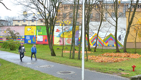 Przyszła jesień, liście opadły z drzew, to i miejscami przejaśniło się, tj. poprawiła się widoczność. W końcu dobrze widoczny stał się mural namalowany na murze okalającym szczycieński areszt.
