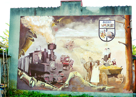 Właściwie jest to tryptyk. Pierwszą część poświęcono historii Faryn, a inspiracją do jej namalowania były stare zdjęcia i pocztówki z tej miejscowości. Autorką jest Urszula Dyl-Nadolna, absolwentka Akademii Sztuk Pięknych w Warszawie i SGGW, która na co dzień pracuje w Nadleśnictwie Spychowo. Teraz uwaga, bo namalowane przez nią postacie są autentyczne (ze starych fotografii), więc może ktoś rozpozna twarze swoich krewnych, bądź znajomych z dawnych czasów. Dodajmy jeszcze, że główny motyw murala – piękna staroświecka ciuchcia to nie fantazja, a również autentyczna maszyna. „Pędziła” ona przez Faryny na trasie Pupy (obecne Spychowo) – Rozogi do 1960 r.(!), nosząc przewrotną nazwę „kurpiowskiej strzały”. Według miejscowych podróżując nią, można było wysiąść, nazbierać w lesie grzybów i znów wsiąść, bo przemieszczała się tak powoli. Środkową część (rynna wykorzystana jest jako pień leśnego drzewa) tworzy postać leśniczego.
