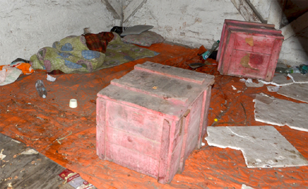 Z kolei w najbardziej zacienionym zakątku niewyraźnie majaczy barłóg bezdomnego otoczony tajemniczymi skrzynkami. Jak nam mówią okoliczni mieszkańcy, w starym młynie zimą koczowali bezdomni. Teraz ich nie ma, ale „życie” tu trwa. Głównie wieczorami spotykają się na popijawy różne ciemne typy.