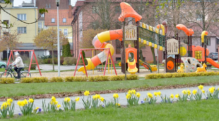 Ogólnie wszystko wygląda tu kolorowo, pięknie i wiosennie. Nawet żółte żonkile, jakby dopasowały się kolorystycznie do najbliższego otoczenia - ogródka zabaw dla dzieci.