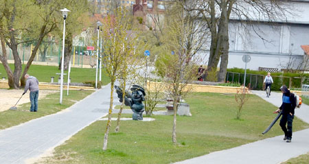 W ostatnim tygodniu kwietnia przedświąteczną i to dość intensywną krzątaninę zauważyliśmy na miejskiej plaży. Tam grabiono piasek i wydmuchiwano resztki pozimowych liści oraz trocin zalegających od strony pasażu Klenczona. Trociny wzięły się stąd, że wycięto kilka spróchniałych drzew. Padły one zresztą nie tylko przy pasażu, ale także przy bazie wodnej MOS-u. Tu zaszły największe zmiany. Zniknął stary płot i zakrzaczenia, dzięki czemu plaża sięga teraz aż pod wysokie ogrodzenie okalające orlikowe boisko do koszykówki.