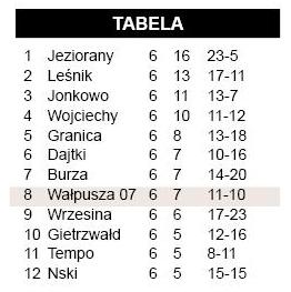 Zespół Wałpuszy rozegrał niezły mecz i niekoniecznie powinien przegrać, ale zanotował trzecią kolejną porażkę. – Na remis to minimum zasłużyliśmy – ocenia trener Cezary Kuciński. Musioł po dograniach Lisiewicza dwukrotnie doprowadzał do wyrównania, ale podział punktów najwyraźniej nie satysfakcjonował żadnej z drużyn. Gdy padła bramka na 2:2, szkoleniowiec Wałpuszy był przekonany, że któraś z drużyn trafi jeszcze do siatki. I się nie przeliczył. W 90. min przyjezdnym dopisało szczęście – piłka odbiła się od ramienia obrońcy gospodarzy i znalazła się w bramce. Zdaniem trenera Kucińskiego duży wpływ na wynik miała dyspozycja golkipera gości.