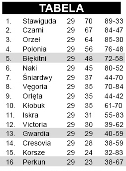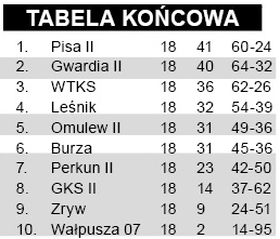 Gwardia nie przedłużyła swojej serii meczów bez porażek i poległa w Orzyszu. Śniardwy zanotowały w ostatnim czasie parę wstydliwych wyników (choćby 1:8) z poprzedniej kolejki, które wynikały głównie z osłabień kadrowych. Gospodarze sprężyli się na pojedynek z gwardzistami, którzy o swój ligowy byt będą musieli walczyć do ostatniej kolejki – a potem przyjdzie ewentualnie poczekać na rozstrzygnięcia w wyższych ligach.