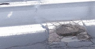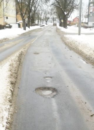 Dziurotwórcze są miejsca, w których znajdują się włazy do rozmaitych studzienek – tam zamarzająca woda poczyniła wraz z naciskiem większych pojazdów niemałe zniszczenia (fot. 6). Zastanawia nas praktykowane w stolicy naszego powiatu zalepianie asfaltem pokryw studzienek (ślady tego widać także na fot. 6). Wygląda to, nawet świeżo po wykonaniu roboty, nieestetycznie, a wkrótce masa bitumiczna i tak się odkleja.