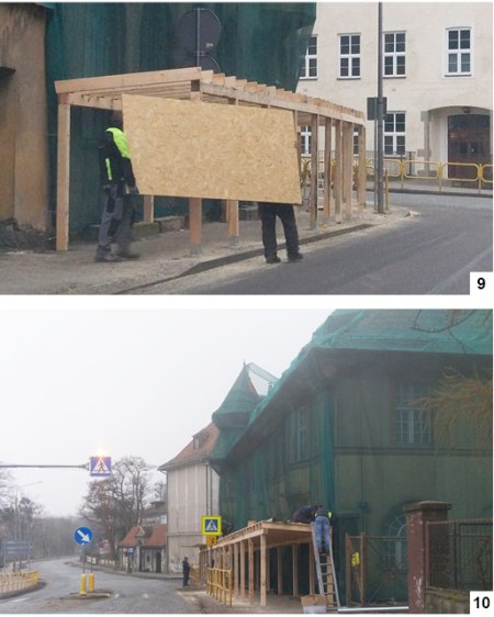 Na początku ostatnich wakacji runęła część dachu byłego internatu ZS 1 w Szczytnie, czyli zabytkowego i niszczejącego budynku będącego od iluś lat w zasobach Akademii Policji. Wkrótce do ścian i dachu przytwierdzono specjalną siatkę ochronną. Przez kilka miesięcy do żadnego nieszczęścia nie doszło, ale w miniony weekend przystąpiono do prac, które mają poprawić bezpieczeństwo w tym miejscu. Niemała ekipa pracowała w sobotę i niedzielę nad budową specjalnego zadaszenia wzdłuż widocznych od strony ulic ścian tego nietypowego architektonicznie budynku (fot. 9, 10.). Nowa konstrukcja doczekała się nawet orynnowania.