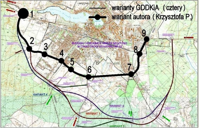 Nie. Jeden z nich, najlepiej pierwszy, powinien być zrealizowany, ale dopiero po wyczerpaniu przepustowości trasy przeze mnie zaproponowanej. Układ komunikacyjny miasta powinien być stopniowo dostosowywany do potrzeb wynikających ze wzrostu ruchu.