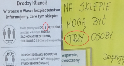 Trwająca wciąż pandemia wymusza na prowadzących obiekty handlowe umieszczanie na drzwiach kolejnych komunikatów dotyczących zmieniających się przepisów i obostrzeń. Klienci, wchodząc do niektórych sklepów, mogą poczuć się zdezorientowani. Oto na jednych z takich drzwi pewnego sklepu w Szczytnie znajdziemy dwie informacje. Z lewej strony wisi napis widocznej na fot. 4 treści, a z prawej umieszczono kartkę z trochę innym przekazem – także widocznym na zdjęciu. No, chyba że chodzi tu o to, że powiększono powierzchnię handlową o dach – wtedy ze sklepu mogłoby korzystać jednocześnie ośmioro klientów.