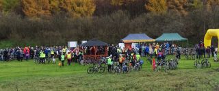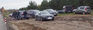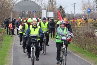 W samo południe 10 listopada niewielkie Ochódno doczekało się prawdopodobnie największego w swoich dziejach najazdu – takie rozważania snuł Zbigniew Stasiłojć, prowadzący imprezę z okazji otwarcia pierwszego odcinka ścieżki rowerowej Szczytno-Biskupiec. Nawała ruszyła ze Szczytna z okolic ul. Ostrołęckiej, a na jej czele stały niezawodne „Kręcioły” (fot. 5), bez których podobny wypad byłby raczej niemożliwy. Starostwo reprezentował Rałał Wilczek, naczelnik Wydziału Komunikacji, Transportu i Dróg. Średniej wieku tworzących peleton nie podamy, ale wśród jadących znalazło się zarówno sporo dzieci pod opieką rodziców, jak i młodzieży czy osób lubiących aktywnie wypoczywać na emeryturze. Gdy po upływie około trzydziestu minut kolarze dotarli do celu, czyli pod dawną stacyjkę Ochódno, nieco się zdziwili mnogością… samochodów (fot. 6) – takie ich grupy można było zobaczyć z okazji rowerowego święta w paru miejscach. Na placyku znajdującym się wokół postawionej niedawno wiaty, będącej pierwszym na trasie miejscem do odpoczynku rowerzystów, zebrali się oficjele wraz z niemałą grupą mieszkańców Szczytna i okolic (fot. 7).