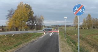 Trasa rowerowa przecina dwie szosy – zjazd z DK 58 w stronę Wałpusza i wspomnianą krajówkę. O ile przez pierwsze z tych miejsc rowerzyści przejechać mogą, to przed drugim powinni zsiąść z jednośladu i przejść przez jezdnię (fot. 10). Z pewnym niepokojem zauważyliśmy, że podczas rajdu bardzo mało osób zastosowało się do przepisów – większość przez miejsce, w którym rower powinno się przeprowadzić, po prostu przejechała.