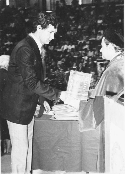 W 1972 roku zostałem wyróżniony srebrną odznaką Wydziału Technologii Drewna, za dobre wyniki w nauce. W roku akademickim 1973/1974, będąc studentem V roku, uzyskałem ze wszystkich obowiązujących egzaminów ocenę 4,5 – z tym, że wówczas najwyższą oceną była 5. Natomiast kończąc studia i uzyskując w 1975 roku tytuł inżyniera, uzyskałem średnia ocenę 4,2 z egzaminów na przestrzeni 5 lat, co było niepowtarzalnym wynikiem na studiach zaocznych. Dziekan Wydziału Technologii Drewna prof. Henryk Jakubowski, człowiek niskiej postury, w trakcie wręczania mi absolutorium (w arenie poznańskiej) rzekł mi, że ucałowałby mnie z radością, ale nie dosięgnie! Ja mu natychmiast odpowiedziałem, że go podsadzę! On na to, żebym sobie za wiele nie pozwalał. Popatrzcie na powyższe zdjęcie z 1975 roku.