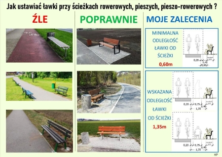 Kształtowanie przyjaznej seniorom przestrzeni publicznej jest zadaniem dla samorządów. Pierwszym krokiem powinno być uświadomienie wagi zagadnienia „ŁAWKI”. Z tego powinien powstać pomysł dogodnego usytuowanie ławek, a później ich zakup oraz rozmieszczenie. Lokalizację ławek należy zaplanować w sposób uwzględniający trasy przemieszczania się osób starszych, przy których ze względu na stan zdrowia muszą robić przystanki w drodze z i do domu. Główne trasy przemieszczeń seniorów prowadzą do obiektów handlowych, przychodni lekarskich, poczty, cmentarza. Należy przestrzegać zasad wypracowanych przez fachowców od urządzania przestrzeni publicznych, a mianowicie: 1) zaleca się rozstaw ławek w odstępach maksymalnie 100 m, 2) przy ławkach powinna znajdować się twarda nawierzchnia pozwalająca na zatrzymanie się osoby na wózku inwalidzkim i dająca jej możliwość siedzenia obok swojego towarzysza, 3) zaleca się, aby, ławka miała oparcie i podłokietniki oraz odpowiednią wysokość dla osób, które mają problemy ze zginaniem kolan, czyli ergonomiczna: dobrze wyprofilowana, a więc nie za wysoka i nie za wąska, 4) w jej sąsiedztwie powinien znajdować się kosz na śmieci, 5) ławka powinna być wygodna i łatwa w utrzymaniu. Istniejące ławki w mieście są niewłaściwie utrzymywane, nie zauważa się śladów ich konserwacji (brak powłok ochronnych i ubytki). Obrazują to załączone zdjęcia.