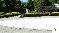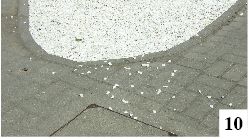 Na krótko przed Świętem Narodowym Trzeciego Maja zmieniono dość radykalnie wygląd wewnątrzchodnikowej wysepki znajdującej się w pobliżu pomnika Orła Białego. Przez lata rosły tam kwiaty, ale teraz zarządzono, że całość zostanie wysypana białymi kamykami (fot. 9) . Co wygląda ładniej i jest łatwiejsze w utrzymaniu – pewnie kwestia sporna. Faktem pozostaje to, że ilekroć znajdziemy się w tamtym rejonie, widzimy kamyki wysypujące się poza przeznaczoną dla nich strefę (fot. 10) . To kwestia niskiego krawężnika, do której można dodać chodzenie po wysepce, wbieganie tam zwierząt, wkopywanie przez kogoś kamyków z nudów itd. itp.,