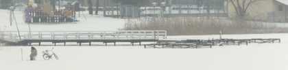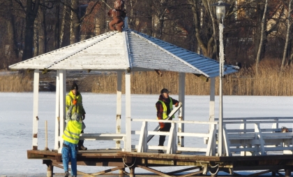 W poprzednim numerze naszego tygodnika pisaliśmy o planowanych na pierwsze półrocze pracach w rejonie szczycieńskiego mola. Zanim ostatni „Kurek” trafił do kiosków, wytyczono w rzeczonym miejscu plac budowy, przyległy teren ogrodzono i przystąpiono do szybkiego demontażu. Zaniepokoił nas stan poszycia blisko samego wejścia na molo. Wystarczyła delikatna demonstracja siły, by spróchniałe najwyraźniej deski się załamały i zdeformowały część konstrukcji (fot. 10.). Jeszcze w środę przed tygodniem znikł „grzybek” po prawej części mola, nazajutrz to samo stało się z jego bliźniakiem po lewej stronie. „Kurek” przyglądał się działaniom trzech pracowników pewnej podostrołęckiej firmy, która podjęła się wykonania prac (fot. 11.). Wystarczyło „spuścić ich z oczu” na zaledwie kwadrans, a oni, używając siekiery i mechanicznej piły, sprawili, że charakterystyczna część mola znikła. Jak widać na zdjęciu, pomocą w rozbiórce nadjeziornej budowli służy mróz. Pewne prace łatwiej wykonuje się, korzystając z zamarzniętej tafli.