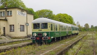 Na liniach do Nidzicy, Czerwonki i Olsztyna widywano dla odmiany lokomotywę SN 61, będącą w istocie wagonem silnikowym, czyli pojazdem służącym zarówno do prowadzenia składu, jak i bezpośredniego przewozu pasażerów. SN 61 produkowano dla PKP na Węgrzech od początku lat. 60 ubiegłego wieku. Na fot. 5 widzimy stację Szymany, a na niej krótki skład specjalny, który przejechał z turystami do Nidzicy w roku 2003. SN 61 to jeden z pierwowzorów dzisiejszych szynobusów jeżdżących po naszych torach. Osiągał podobną prędkość (108 km/h), ale miejsc siedzących oferował mniej niż nawet krótsze autobusy szynowe z bydgoskiej Pesy.