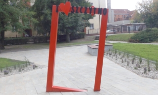 Z pokazanej na fot. 8. strony mamy fragmenty budynków i podwórko, z drugiej (fot. 9) – drzewa, krzewy i kawałek ulicy. Druga strona wygląda ciut atrakcyjniej, czy jest ona jednak reprezentacyjna dla Szczytna? Choć ramka jest nowiutka, dolna jej część została już nieco starta, ktoś ponadto zdrapał farbę z części napisu i spod czerni przeziera trochę bieli (powiększenie w rogu fot. 9). Pomyśleliśmy sobie, czy nie można by było odnieść się jakoś konkretniej do Szczytna choćby kolorystycznie? Na przykład zielona rama, serce oczywiście czerwone i biały napis?