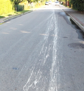 Jeszcze przed Dniami i Nocami jeden z Czytelników poinformował nas, że na ulicach Paderewskiego i Kajki musieli pracować jacyś nietrzeźwi drogowcy, bo wymalowano tam dziwaczne linie. Czytelnik oczywiście żartował, bo to, co widział, trudno za oznakowanie poziome uznać. Udaliśmy się na miejsce, zobaczyliśmy to, co mieliśmy zobaczyć, odczekaliśmy tydzień, wróciliśmy i widok był ten sam (fot. 10). Ciecz, która komuś z pojazdu wyciekała, mimo intensywnych opadów deszczu i ruchu samochodów na asfalcie została i wygląda jak slalomowa wersja kombinacji ciągłej z przerywaną.
