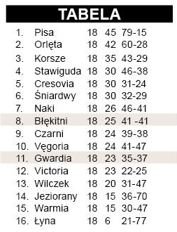 Zespół ze Szczytna pojechał do Jezioran z dość krótką ławką rezerwowych, ale nie miało to negatywnego wpływu na końcowy wynik. Wprawdzie gospodarze dość szybko objęli prowadzenie, lecz już wkrótce gwardziści rozpoczęli ostre strzelanie. - Zagraliśmy dobry mecz – podsumowuje trener Mariusz Korczakowski, który ma pewne zastrzeżenia w stosunku do swoich piłkarzy za niemrawy początek i gapiostwo przy ostatniej bramce sobotniego spotkania. – Jeziorany dobrze operowały piłką, ale były dziurawe w obronie. Grały bardzo wysoko i nadziewały się na nasze kontry. Gwardziści rozkręcili się na całego po bramce Jacka Jodełki zdobytej uderzeniem z 18 m. Ostrzał bramki MKS-u zakończył Jakub Kulesik, który wykorzystał rzut karny podyktowany za faul na nim samym. {akeebasubs !*}