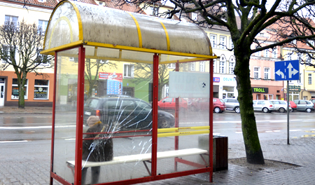 Niedawno pialiśmy o rozbitej szybie we wiacie przystanku miejskiej komunikacji przy ul. Odrodzenia. Nie minęło wiele czasu, a już wandale dali ponownie znać o sobie. Znowu na tylnej ściance pojawiła się pajęczyna – charakterystyczny ślad po silnym uderzeniu w tworzywo imitujące szkło. Podobny, choć mniejszy ślad widać na nowej wiacie przy ul. Kolejowej.