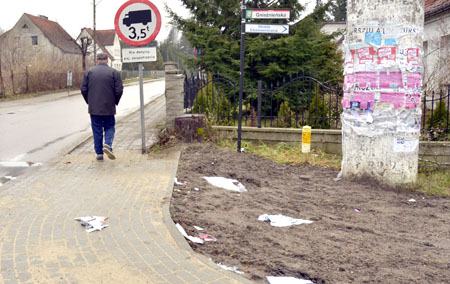 Przy okazji warto zwrócić uwagę na walające się przed znakiem papierzyska. Po prostu wiatr zdmuchnął ze słupa ogłoszeniowego źle przyklejone ogłoszenia, których teraz nie ma kto uprzątnąć. Podobnie wygląda otoczenie podobnego słupa stojącego naprzeciw poczty.{/akeebasubs}