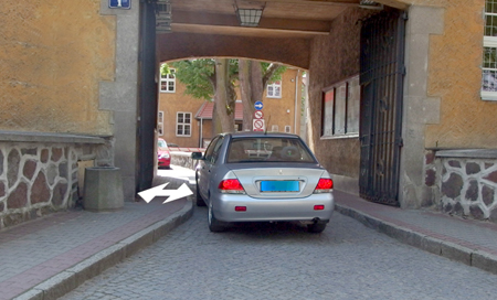 Wejście do szacownego gmachu ratusza jest oczywiście opatrzone wygodnym podjazdem, który nie sprawia najmniejszych kłopotów osobom w wózkach inwalidzkich. Musi być jednak spełniony pewien warunek wstępny - najpierw trzeba do tego podjazdu dotrzeć. - Tylko jak to zrobić, skoro chodnik w bramie wjazdowej jest zbyt wąski – skarży się nasz rozmówca. Po prostu jego wózek nie mieści się między ścianą bramy, a krawędzią chodnika, co unaocznia biała strzałka na zdjęciu.{/akeebasubs}