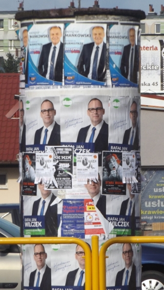 Panowie, zarówno na plakatach, banerach czy znajdujących się w skrzynkach pocztowych mniej czy bardziej pomysłowych ulotkach, dbają o stosowną prezencję. Musi być: delikatny uśmiech albo zatroskane spojrzenie, ponadto pozować do takiego zdjęcia bez marynarki czy choćby krawatu nie wypada. Panie teoretycznie mają pierwszeństwo, ale być może nie chcą z niego korzystać – widocznie trzymają jakieś asy w rękawie. „Kurek” nie był, rzecz jasna, w każdym zakątku miasta i kto wie, czy nie dlatego zdołał znaleźć plakaty wyborcze tylko jednej z przedstawicielek płci pięknej – zresztą w męskim towarzystwie (fot. 10).