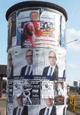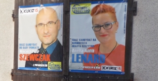 Panowie, zarówno na plakatach, banerach czy znajdujących się w skrzynkach pocztowych mniej czy bardziej pomysłowych ulotkach, dbają o stosowną prezencję. Musi być: delikatny uśmiech albo zatroskane spojrzenie, ponadto pozować do takiego zdjęcia bez marynarki czy choćby krawatu nie wypada. Panie teoretycznie mają pierwszeństwo, ale być może nie chcą z niego korzystać – widocznie trzymają jakieś asy w rękawie. „Kurek” nie był, rzecz jasna, w każdym zakątku miasta i kto wie, czy nie dlatego zdołał znaleźć plakaty wyborcze tylko jednej z przedstawicielek płci pięknej – zresztą w męskim towarzystwie (fot. 10).