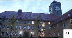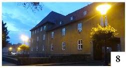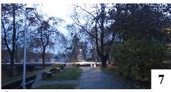 Święcących lamp miało być w Szczytnie mniej – i tak się stało. We wczesny sobotni ranek wyruszyliśmy sobie na przechadzkę miejskimi ulicami i alejkami. W parku na ul. Pasymskiej paliła się co druga ledowa lampa. Wyłączono całą baterię lampek tworzących klimat w hamakowej strefie relaksu, to miejsce było jednak rzęsiście oświetlone reflektorem. Na plaży owo zagęszczenie było jeszcze mniejsze. Przeżyliśmy pewne zdziwienie, gdy tuż po wybiciu przez ratuszowe dzwony godziny siódmej wszystkie lampy momentalnie zgasły. No, może nie wszystkie, ponieważ gdy spojrzeliśmy na drugą stronę ul. Sienkiewicza (okolice kanału), ledy jeszcze świeciły (fot. 7). Minęły może dwie, trzy minuty – i także zgasły. Do wschodu słońca wówczas trochę jeszcze brakowało i widoczność nie była najlepsza. Nie świeciły duże lampy uliczne na Sienkiewicza, jaśniutko było natomiast z jakichś powodów przed wjazdem do ratusza (fot. 8) i na dziedzińcu, oświetlenie zostało także częściowo włączone w samym gmachu (fot. 9).