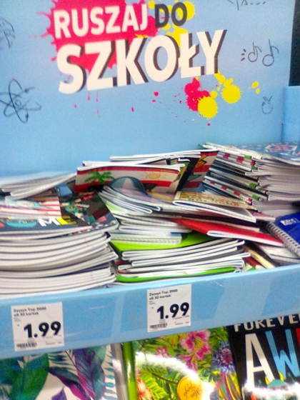 Minister edukacji stwierdził, że na wypadek strajku trzeba przezornie uniknąć powstania zaległości i wcześniej wrócić do szkoły – takie wnioski nasuwają się po wizytach w niektórych sklepach. Oto już w połowie lipca wstawiono w nich specjalne regały z chwytliwym hasłem (fot. 9). Dzieciaki są z pewnością rozpromienione, gdy po niespełna połowie wakacji przypomina im się, że wszystko szybko się kończy. Oczywiście letni odpoczynek trwać będzie jeszcze ponad miesiąc, ale pomysły zbyt pazernych handlowców (np. Boże Narodzenie na półkach już w październiku) mogą zwyczajnie irytować.