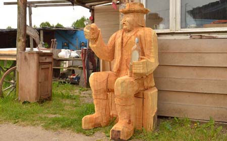 Nieco na uboczu placu, na którym odbywa się targ starociami w Olszynach, zauważyliśmy okazałą drewnianą rzeźbę. Przedstawia ona postać mężczyzny – biesiadnika i jest oczywiście dziełem sołtysa. W jednej dłoni trzyma kieliszek (postać, nie sołtys), a właściwie musztardówkę, w drugiej flaszkę z wiadomą zawartością. Z miny widać, że postać jest w dobrym humorze, choć nie powinna, bo dzieło nosi tytuł „Chłop + 500”. Jak się domyślamy jest satyrą na rządowy program „Rodzina 500 plus”. Zdaniem twórcy taki właśnie finał czeka to przedsięwzięcie, czyli ogólne pijaństwo wśród jego beneficjentów. Cóż, kto przedkłada biesiadowanie nad dobro rodziny, będzie może i tak postępował, my sądzimy, że pieniądze zostaną wykorzystane jednak na dobre cele, choć margines, czyli tzw. rodziny patologiczne chciałyby je przepić. Jest jednak zabezpieczenie. - W przypadku stwierdzenia przez MOPS niewłaściwego wydatkowania pieniędzy, będziemy mieli prawo zamieniać wypłatę 500 zł na świadczenie rzeczowe, jak żywność, odzież i usługi edukacyjne – ostrzega Hanna Bojarska, dyrektor MOPS-u w Szczytnie.