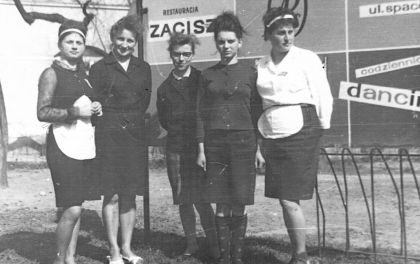 Nietrudno się domyśleć, że w dzień przesiadywaliśmy w kawiarniach, a wieczorem na dancingach. W tamtym czasie było pięć liczących się lokali w naszym mieście: „Mocca” na ul. Polskiej – naprzeciw MDK-u, „Danusia” na rogu ul. 3 Maja i Odrodzenia, obecnie mieści się tam sklep spożywczy, trzeci o największym wzięciu - „Muszelka”. Był to samodzielny parterowy pawilon, usytuowany w miejscu, gdzie teraz postawiono nowe kamienice, naprzeciw głównego ronda. Mieszczą się w nich sklepy o udanej i wkomponowanej w otoczenie architekturze. Popatrzcie na historyczne już zdjęcie pracowników „Muszelki”.